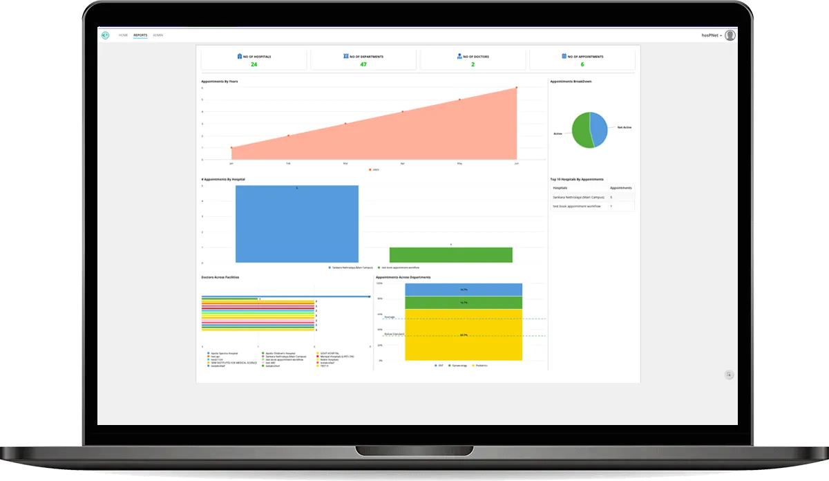 A Hospital system provides reporting and analytics capabilities to track hospital performance, appointment status day-to-day, and top hospitals , Dashboard for doctors and patients.