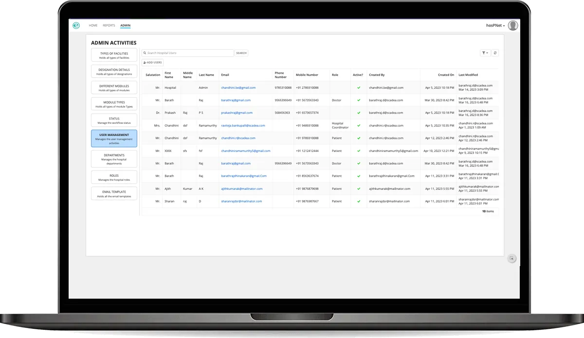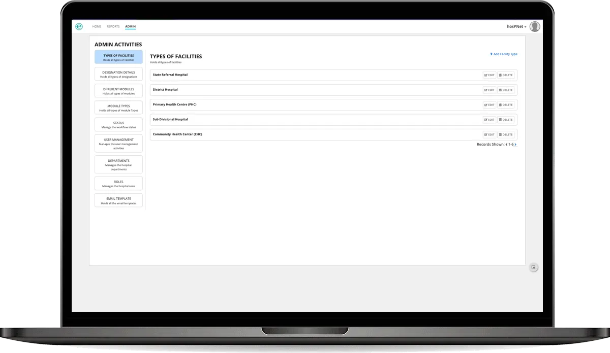 Providing the functionality to update or delete the hospital, type of hospitals, hospital officer details, designation details, modules, module type, module selection, status, hospital user, departments, roles, and email template.